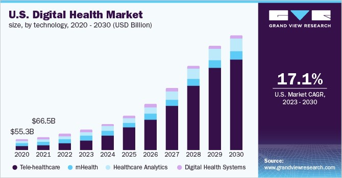 The global digital healthcare ecosystem was valued at $ 211.0 billion in 2022 and is expected to witness a CAGR of 18.6% from 2023 to 2030. The increasing market size can be attributed to multiple factors, such as increased use of smartphones, improved internet connectivity, advancements in healthcare IT infrastructure, the need to minimize healthcare costs, the rapidly increasing prevalence of chronic diseases, and the increased accessibility of virtual care.