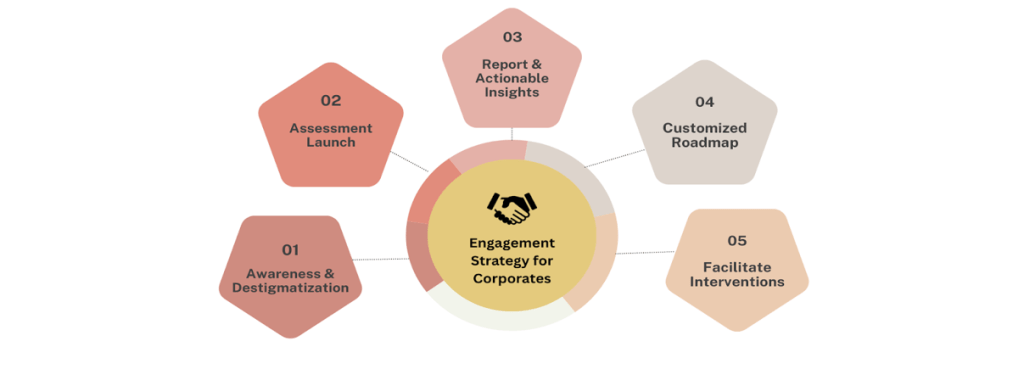 LiveLoveLaugh’s corporate engagement model is a stepwise, insight-driven approach designed to enable organizations to build mentally healthy workplaces. The blueprint outlines a comprehensive five-stage process: