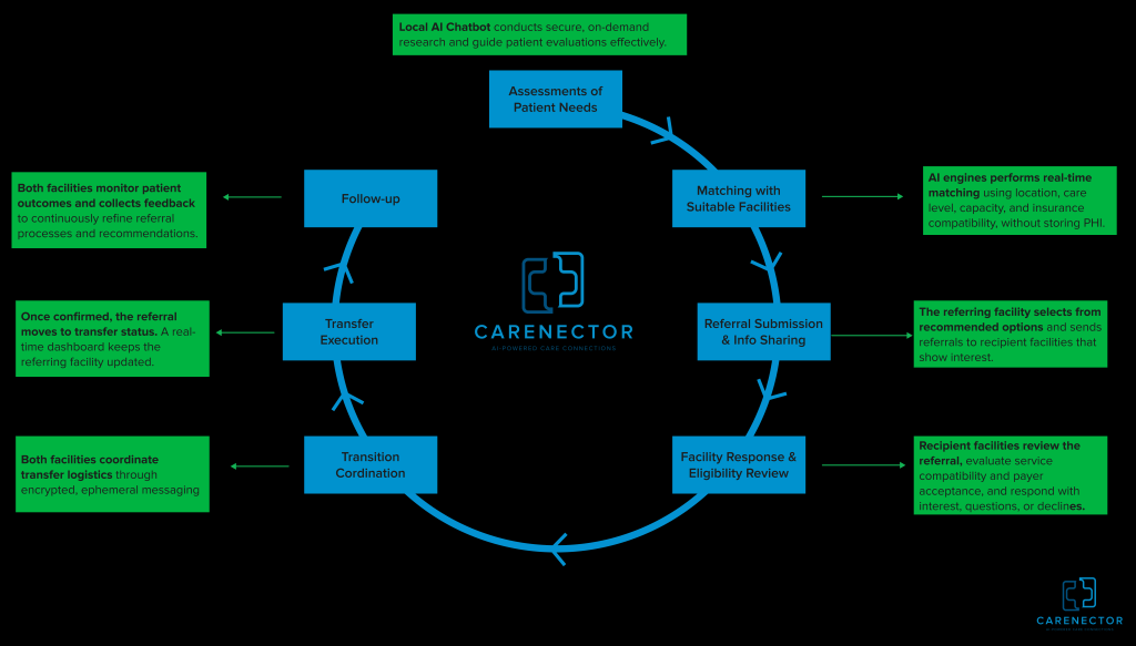 The platform they developed addresses both sides. For individuals and families, Carenector enables searches based on ZIP code, insurance, and care needs without upfront disclosure of sensitive health information, providing transparent results with real-time availability. For healthcare facilities, the system employs real-time matching across multiple dimensions: care level, geographic proximity, insurance compatibility, current capacity, and quality metrics.